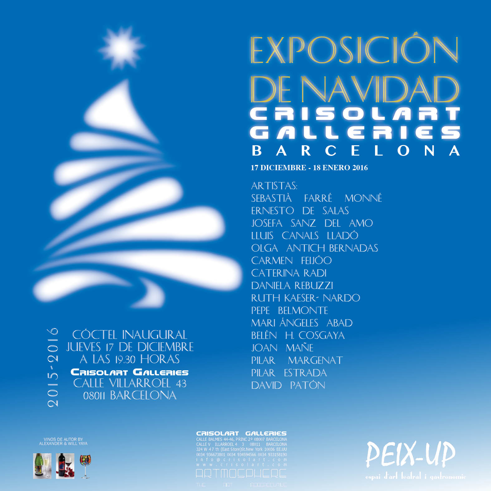 Del 17 de diciembre al 18 de enero participaré en la la Exposición Colectiva de Navidad que organiza Crisolart Galleries en el Espacio de Arte PEIX-UP de Barcelona. La inauguración será el día 17 de diciembre a las 19:30 para los que os apetezca asistir y degustar los famosos vinos del Espacio.